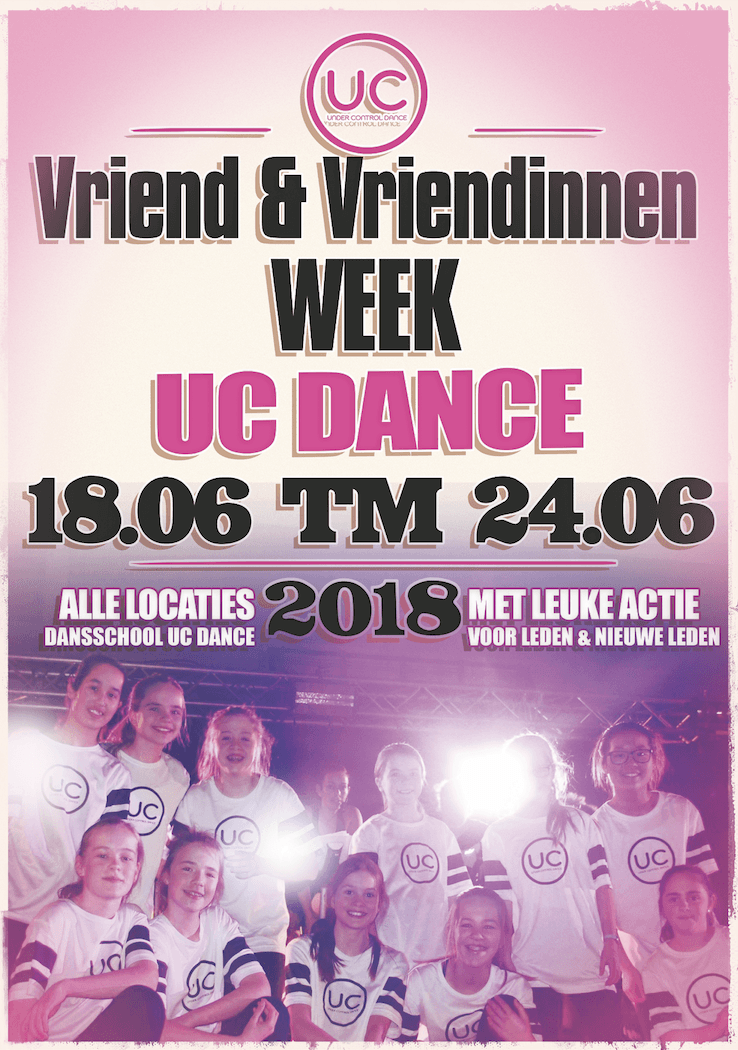 A.s. maandag 18 juni t/m zondag 24 juni mogen alle leerlingen van UC Dance op alle locaties een vriend of vriendin meenemen naar de les. Deze hele week staat in het teken van veel dans, fun en gezelligheid. Tevens hebben we er een leuke actie aan gekoppeld