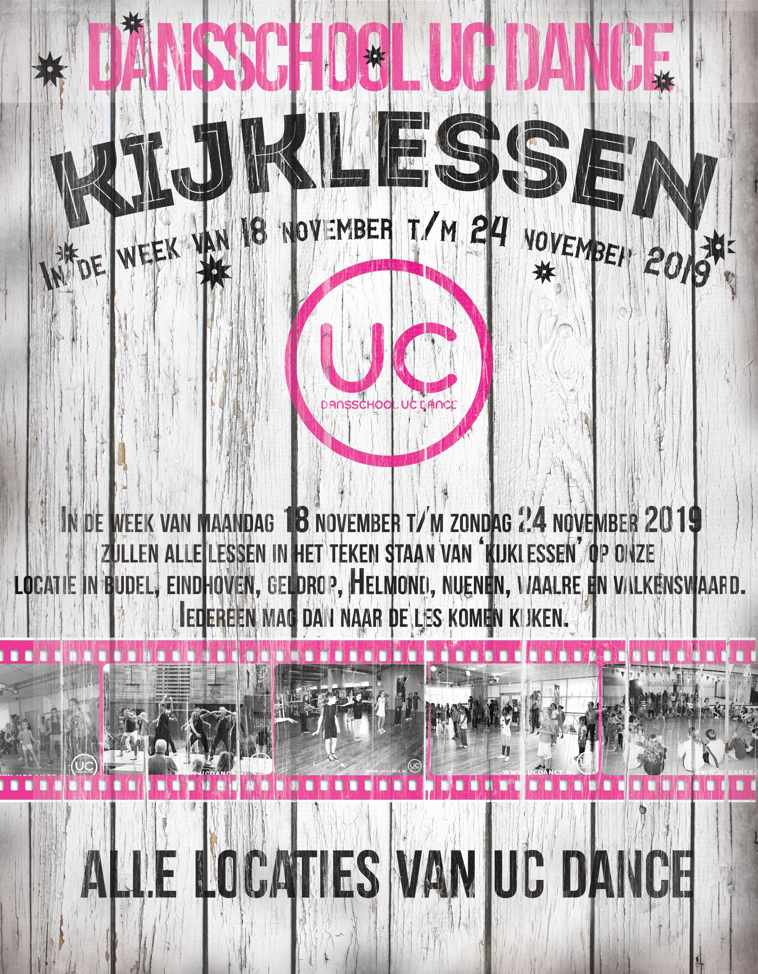 In de week van maandag 18 november t/m zondag 24 november 2019 staan alle lessen (m.u.v. de selectiegroepen) van UC Dance in het teken van KIJKLESSEN! Ouders/verzorgers, vriendjes en vriendinnetjes en opa’s en oma’s mogen dan komen kijken bij de les.