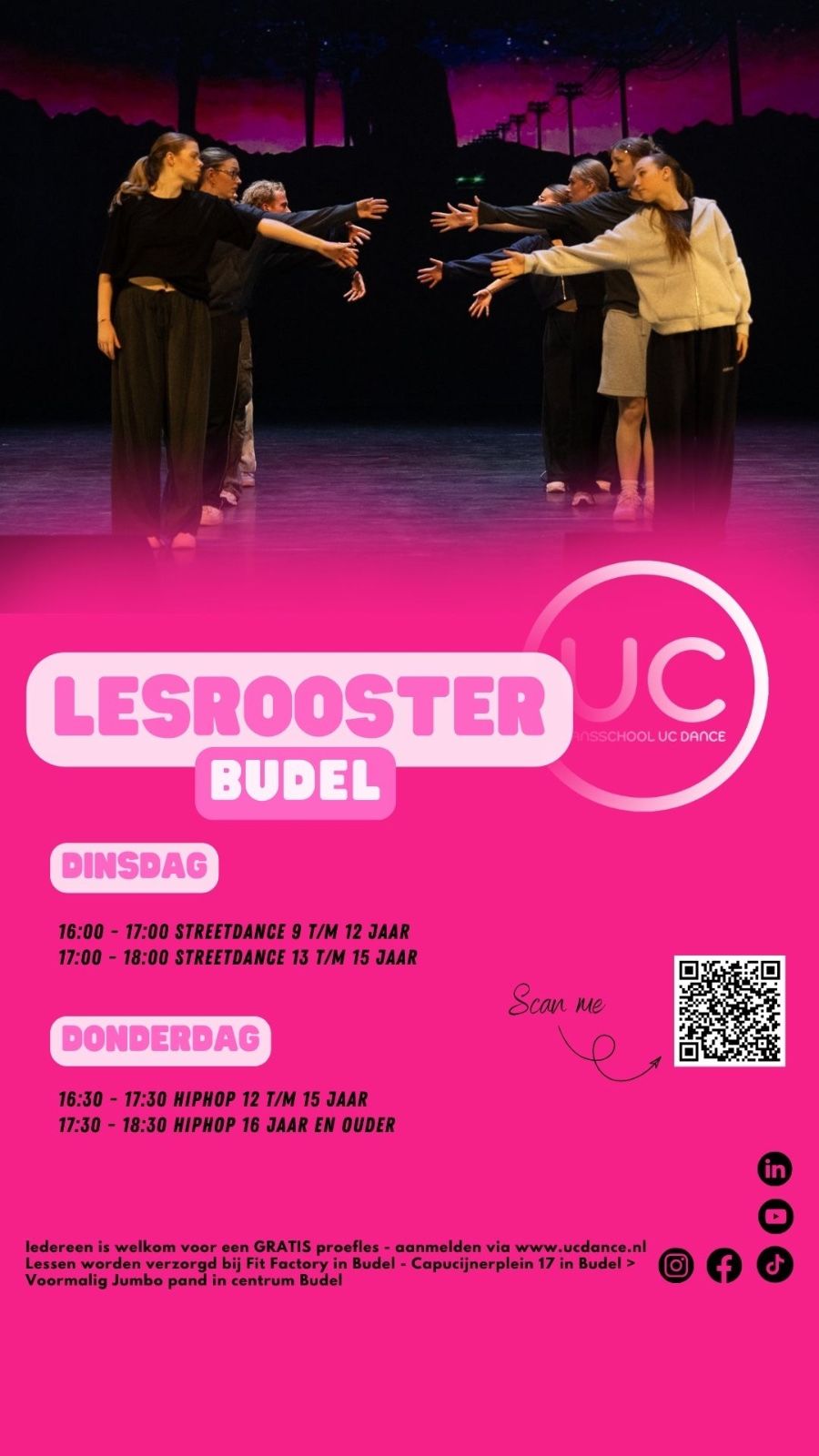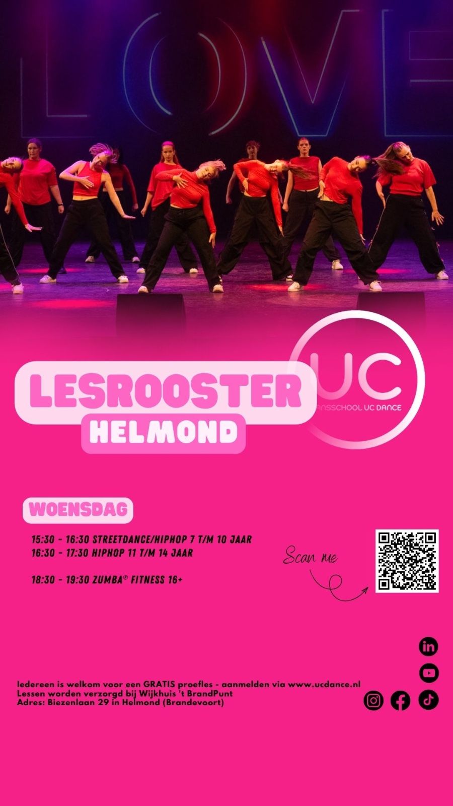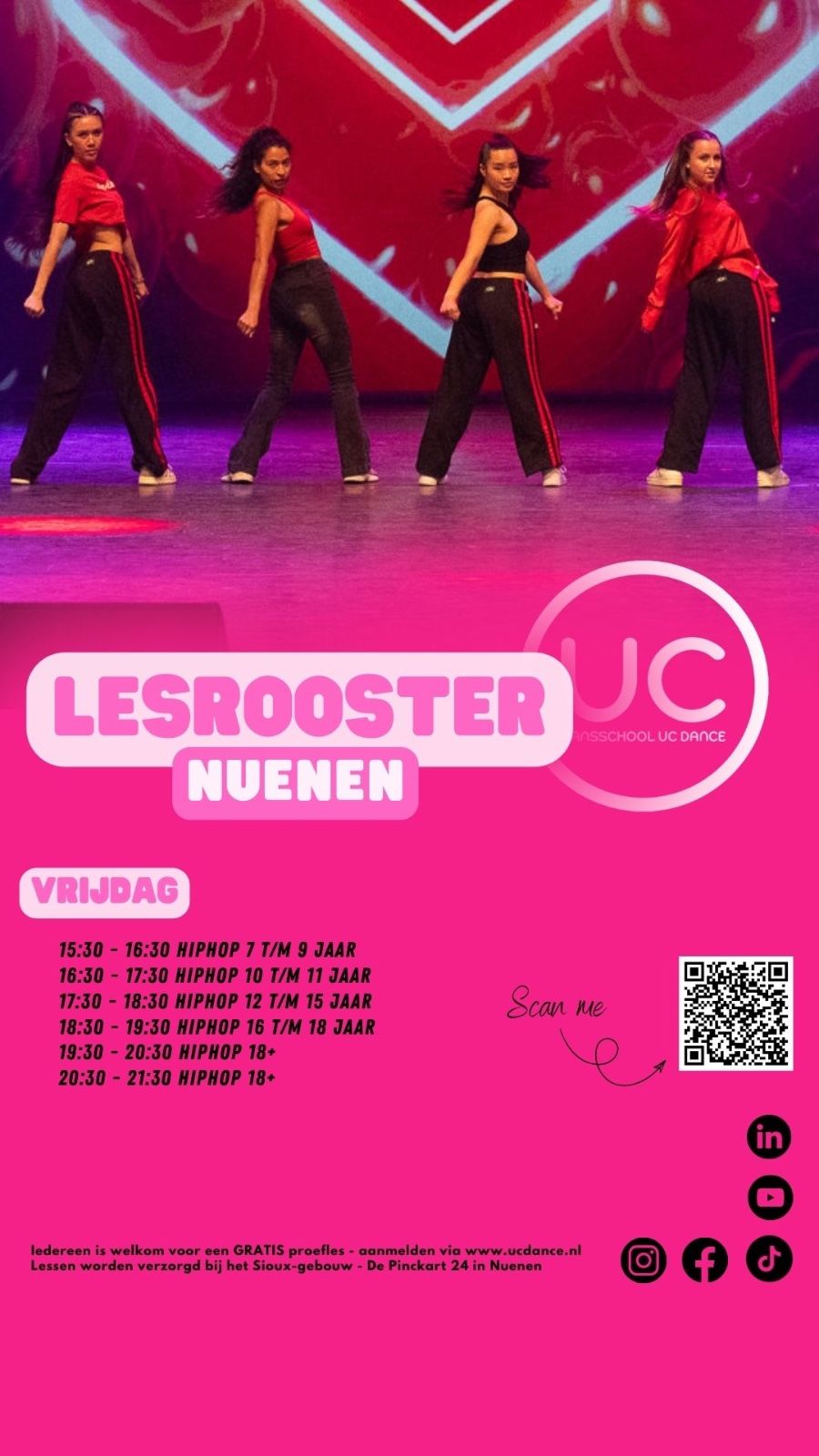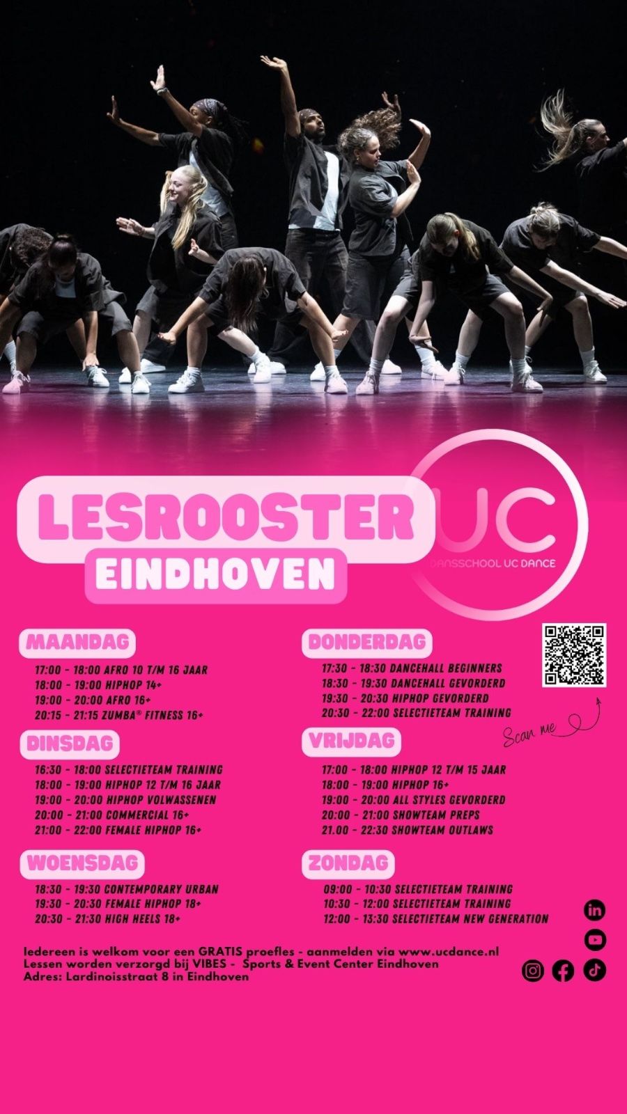 Bekijk het volledige lesrooster hieronder of op onze website per locatie: https://www.ucdance.nl/locatie/